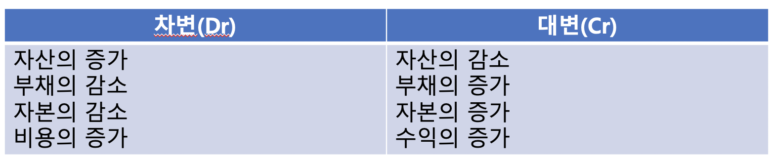 왼쪽 합계 = 오른쪽 합계 : 자산이 증가한 만큼 차변에는 증가 한 금액을, 대변에는 같은 금액으로 감소한 금액을 적어준다.